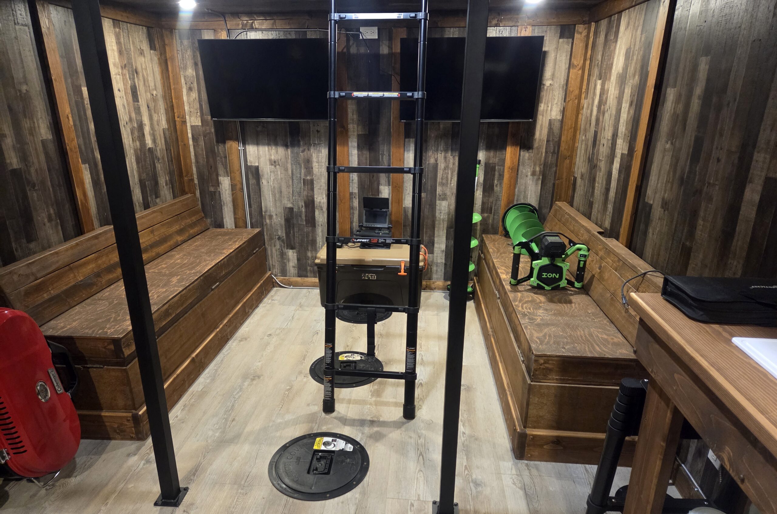 Complete with (2) 42” TVs on the wall to catch the game or watch a movie while you amplify the screen on our underwater camera to watch all the action live! The JackPot has (6) rods, an assortment of lures and bait to help you track down the monsters lurking under the ice!