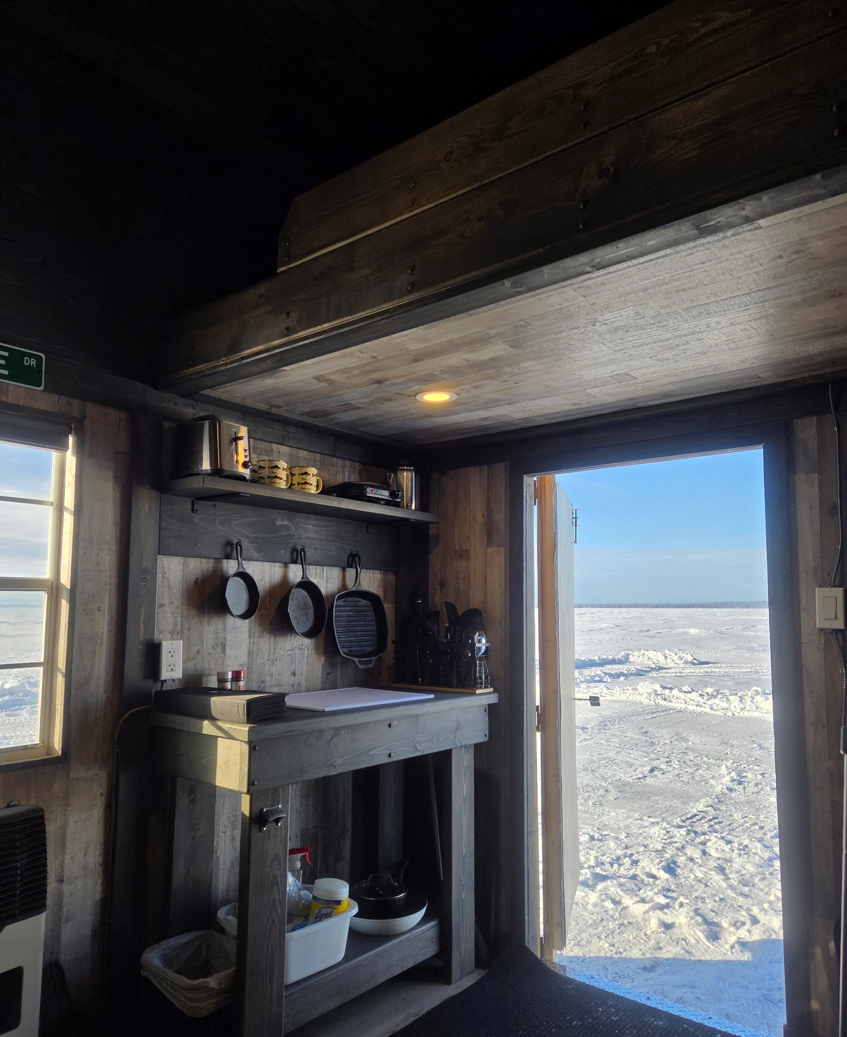 The JackPot is our luxury 10×16 shack that fishes (6) and has (6) beds- (2) larger beds and (2) smaller beds in the loft, then (2) bench’s that convert to beds on the bottom level. The JackPot is fully solar sufficient and runs off a temperature-controlled propane furnace and diesel heater to keep you warm and cozy.